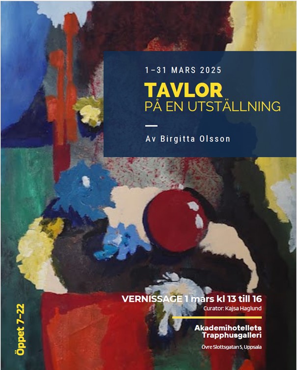 Vernissage lördag 1 mars kl 13-16 Tavlor på en utställning av Birgitta Olsson. Utställningen pågår 1–31 mars 2025 och kan ses varje dag under hotellets öppettider kl 7-22. Curator: Kajsa Haglund Välkomna!