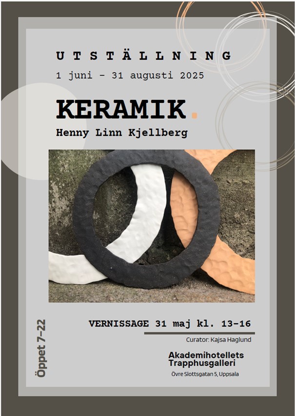Utställning Keramik Henny Linn Kjellberg. Utställningen kan ses i Akademihotellets Trapphusgalleri 1 juni-31 aug 2025 under hotellets öppettider dagligen kl 7-22. Curator: Kajsa Haglund Välkommen!